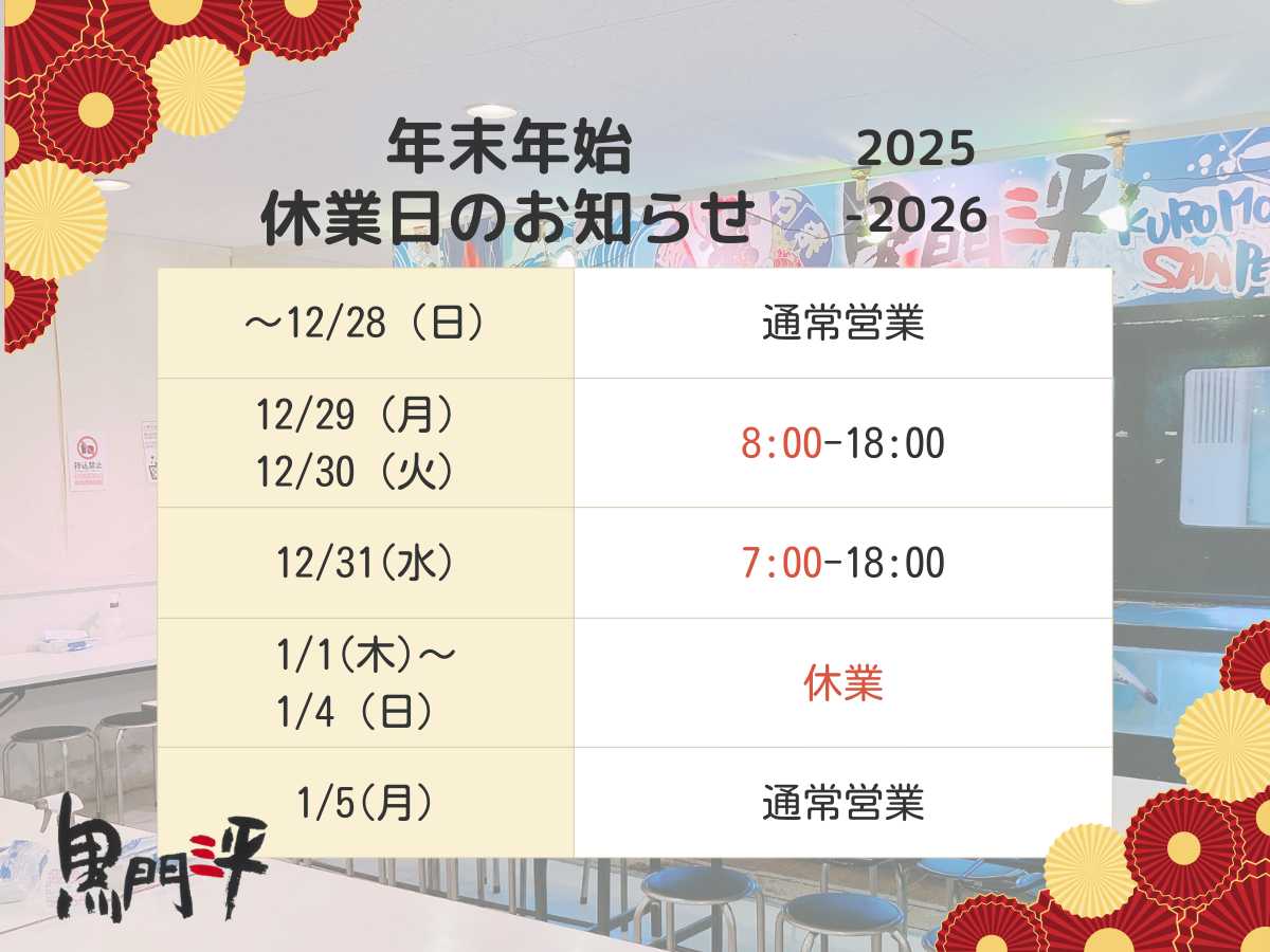 2025年12月26日 / 最終更新日時 : 2025年12月26日 YasuiYumiko 黒門市場店 【黒門市場店】年末年始営業日 年末年始 営業時間のご案内・12月28日(日)まで 通常営業・12月29日(月)、29日(火) 8:00~18:00・12月31日(水)7:00~18:00・2026年1月1日(木)~4日(日) お正月休み※12月29日~31日はお席のご予約を承れません。あらかじめご了承くださいませ。 Follow me! @Sanpei_Ja FacebookBlueskyCopy